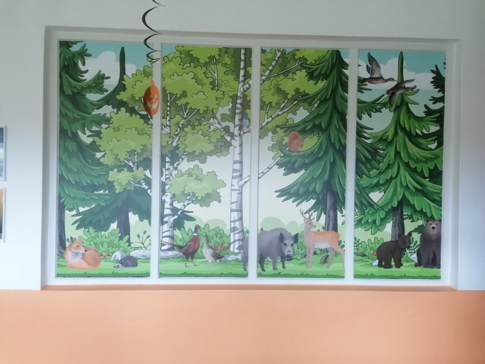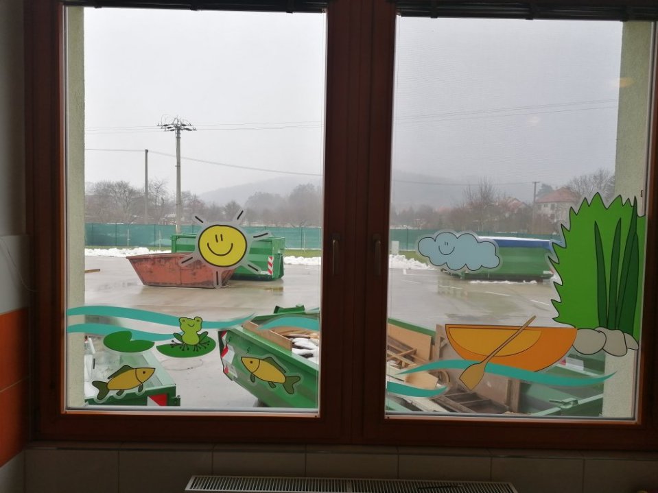 Volitelná folie - buď průhledná "vitrážová" viditelná z obou stran stejně, nebo pouze jednostranná folie s grafikou, která má vizuálně oddělit třídu například od chodby. Je možné udělat celopolep a zakrýt tak celou plochu okna, nebo je možné vytvořit i částečný polep, vyřezaný do tvaru, opět v obou variantách.